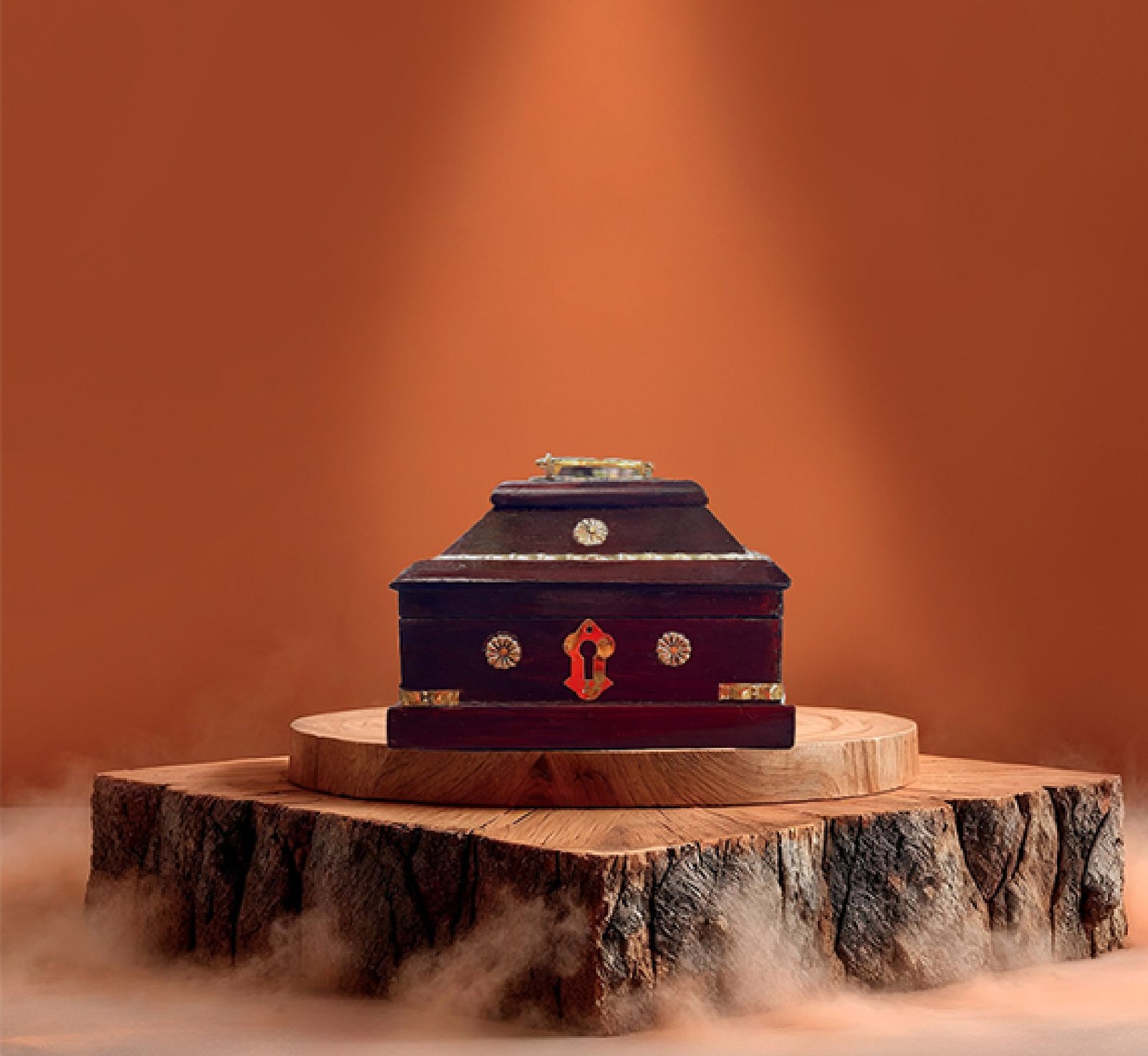 This elegant jewellery box is crafted from rich, dark rosewood, known for its strength, durability, and natural beauty. The box reflects traditional craftsmanship combined with functional design, making it both a decorative and practical storage piece.