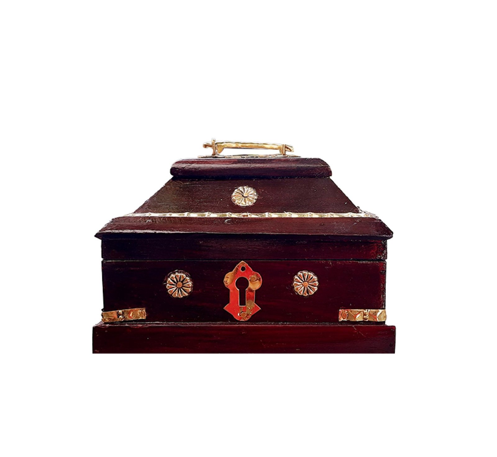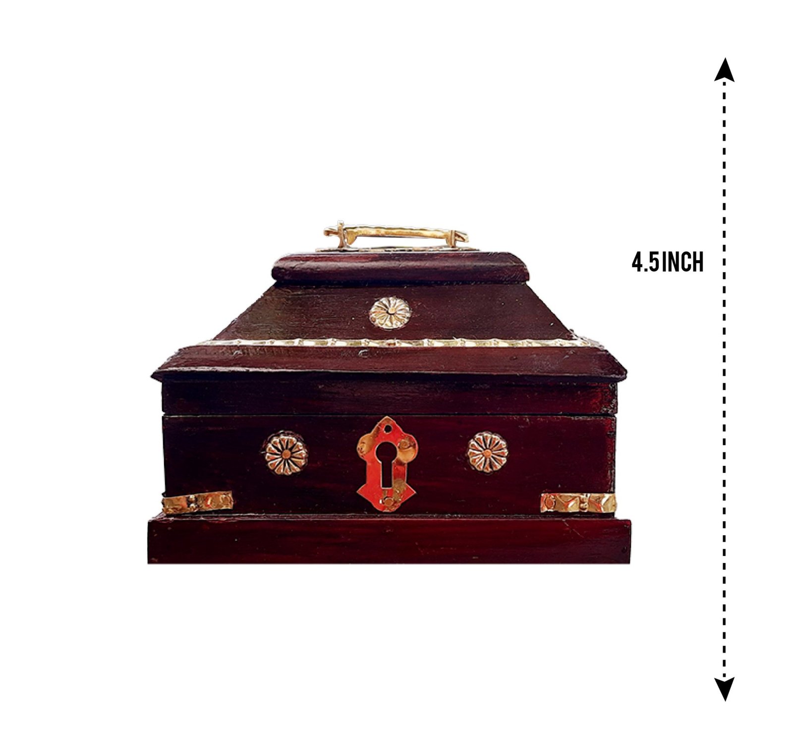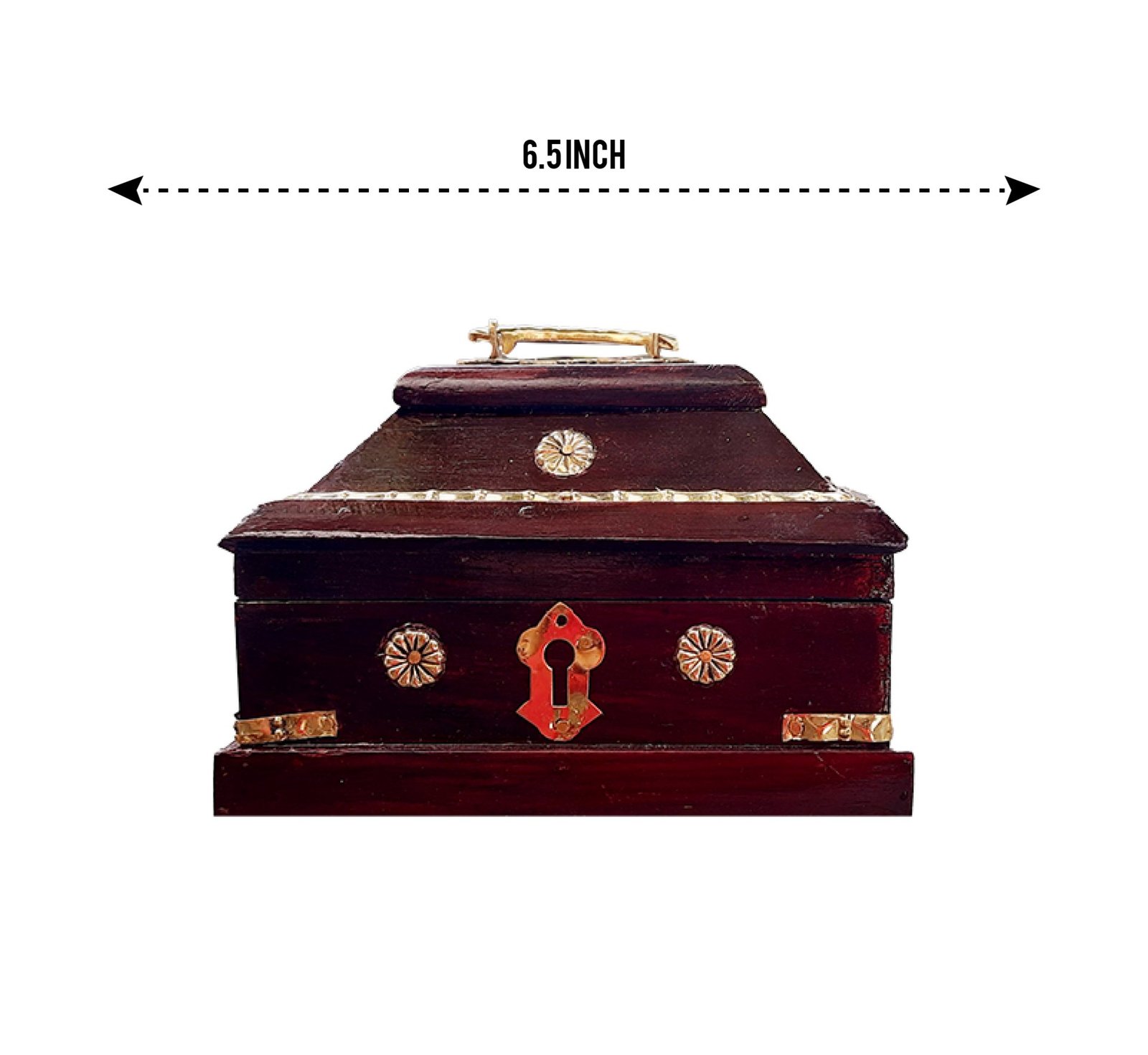 The front features a traditional keyhole design, indicating that the box can be locked for safety. This makes it ideal for storing valuable jewellery and keepsakes. Decorative brass or gold-colored metal fittings are placed symmetrically on the front and sides, adding charm and an old-world aesthetic.